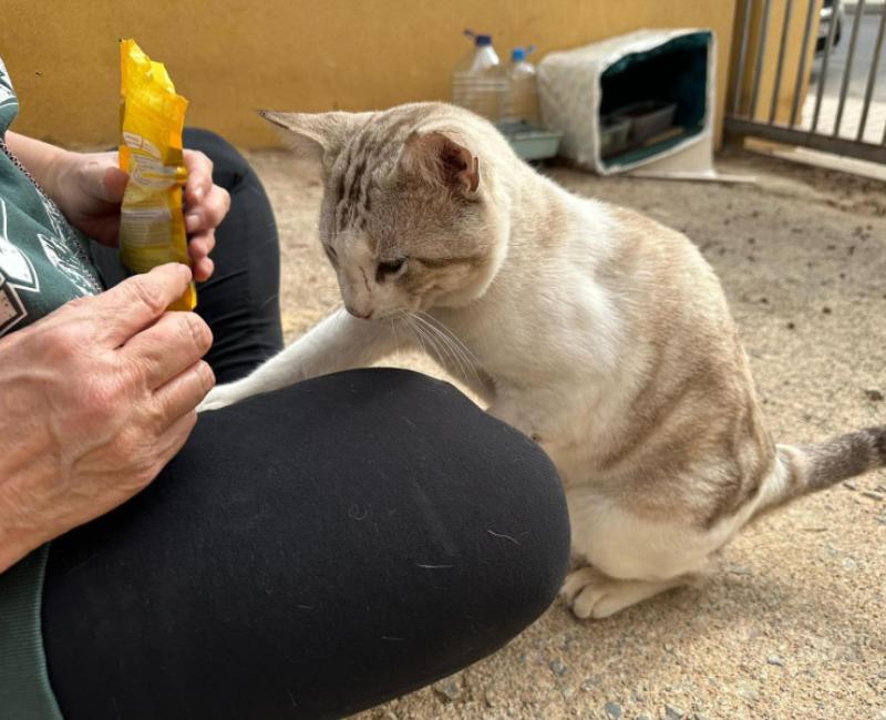 Hace un par de meses apareció en una colonia. No saben cómo llegó allí pero a los pocos días se había hecho el dueño y señor de toda la colonia, echando a todos de allí. Los pobres que llevaban allí años, andaban desubicados en la carretera debajo de los coches y no les dejaba ni resguardarse en las casetas ni comer. Así que su cuidadora nos escribió súper desesperada, rogando un hueco para él.