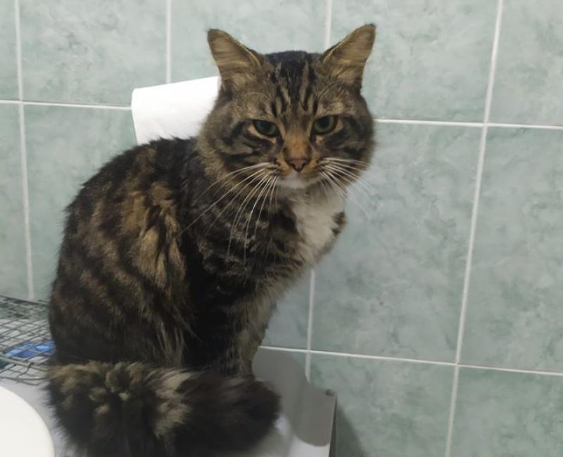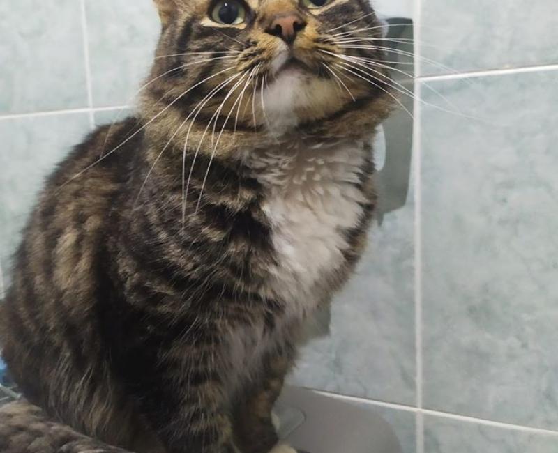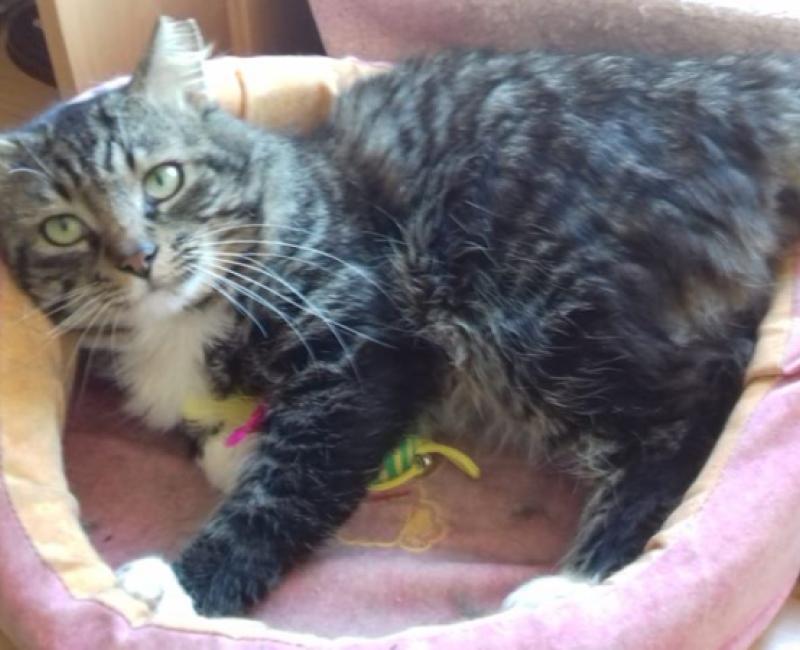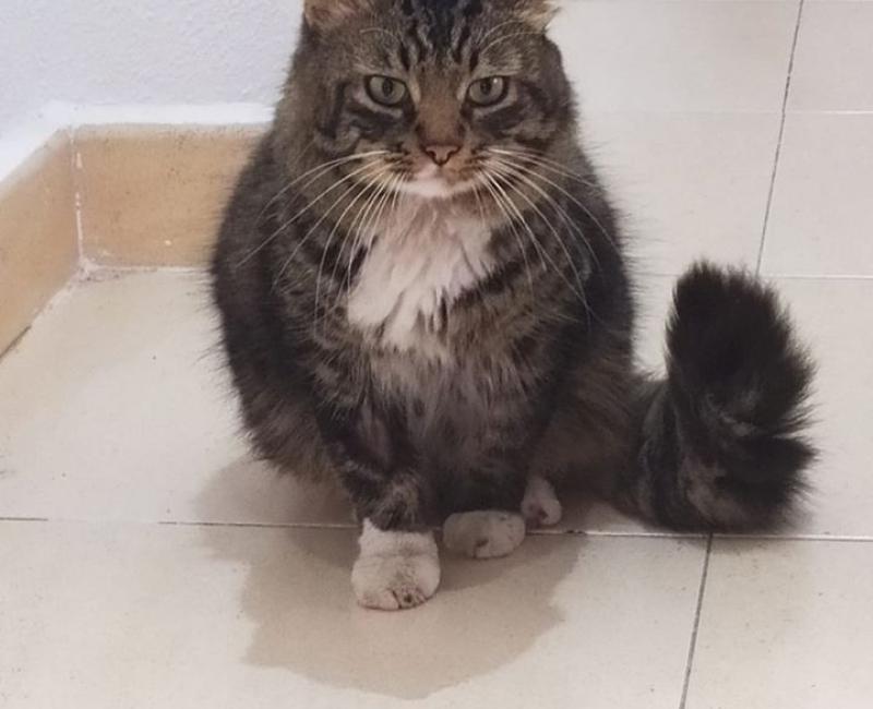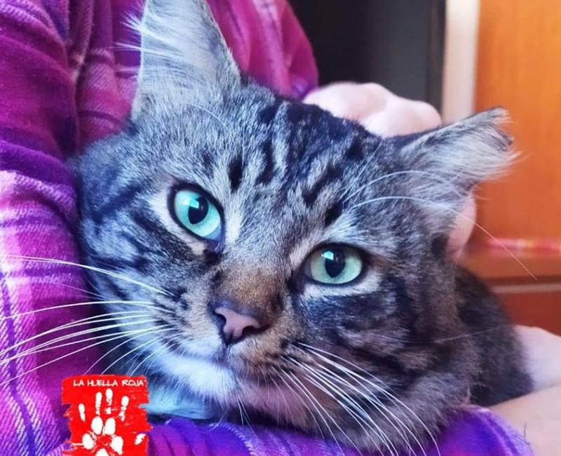 Es un gato súper bueno. Está algo cojo de una patita trasera. Ya ha pasado por el veterinario y se le ha realizado también un test al que ha dado negativo a leucemia e inmunodeficiencia.
