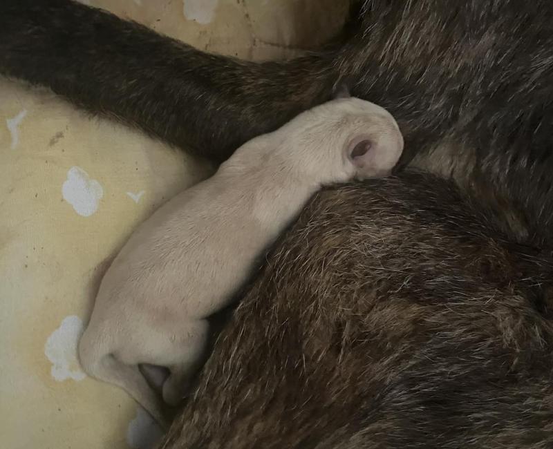 Teníamos cita para que revisaran esa patita y la delgadez, y para nuestra sorpresa cuando fuimos por la mañana a su chenil, ¡había parido!!. Lo que estáis leyendo, PARIDO, dos preciosos bebes, por desgracia uno muerto y la luchadora de la pequeña Tutti Frutti.