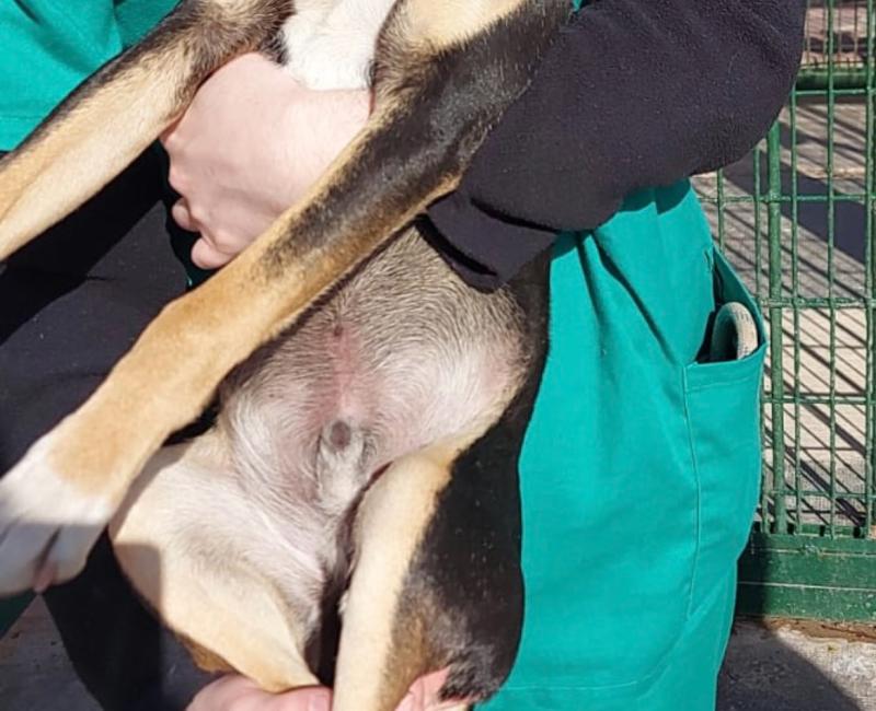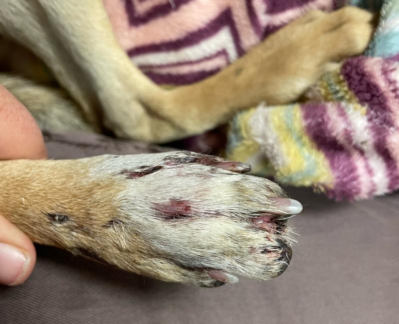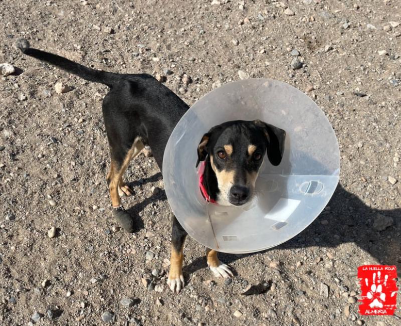 Sufre quemado por abrasión en su patita derecha trasera y ha perdido una uña, y requiere curas diarias con cremas antibióticas y apósitos linitul, así que confiamos que en breve esa patita esté perfecta.