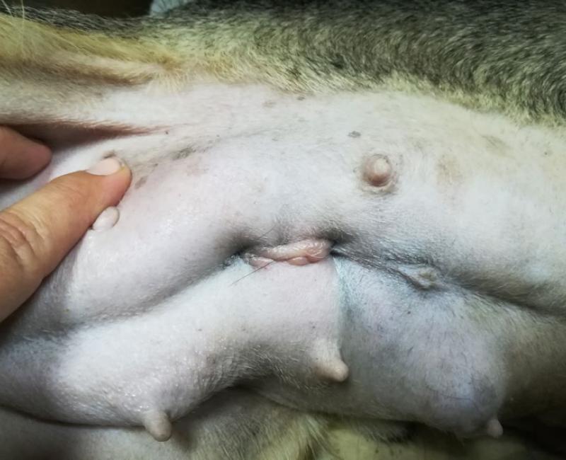 Pedimos que la sacarán de la jaula para un análisis y observamos la vulva inflamada. Al prestar atención, vimos que expulsaba muchísimas pus (PIOMETRA) así que tuvo que entrar en quirófano de urgencia, sino se moría. Una vez en quirófano, también se observó 4 tumores en las mamás pero se decidió primero la urgencia, y más adelante se le extirparán los tumores.