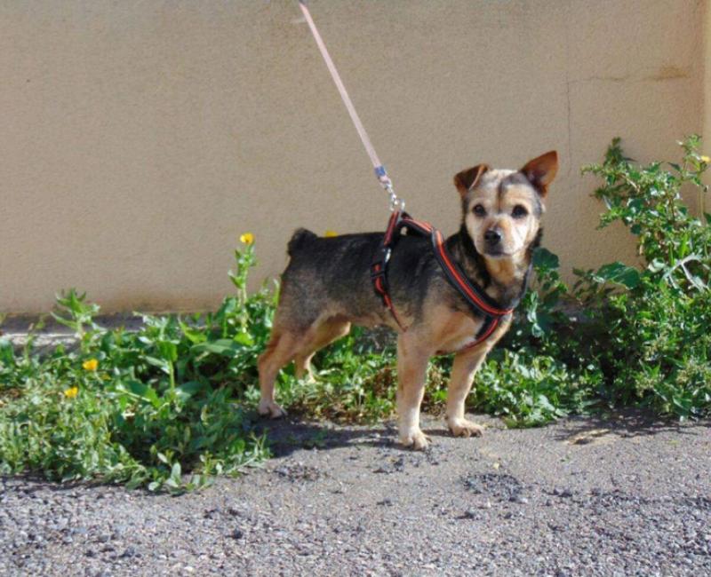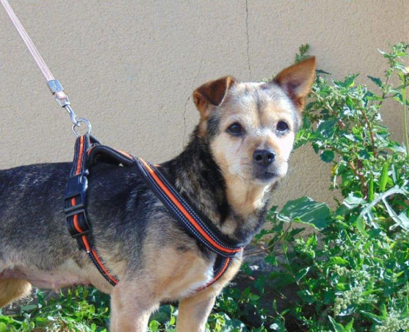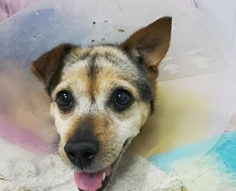 Ahora se recupera perfectamente. Es una perra muy alegre y ágil, pesa unos 8 kilos. Convive con perros y gatos.