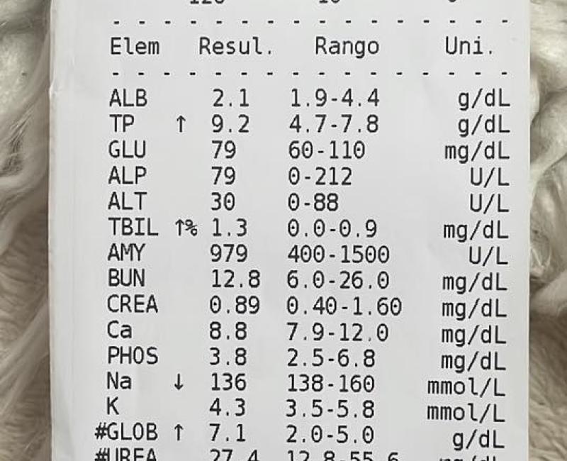 Ya le han realizado análisis y test. Los primeros resultados es que tiene Erlichia, enfermedad producida por la picadura de una garrapata pero con fácil cura. Con un tratamiento de doxiciclina durante 28 días el problema estará resuelto. Pero en los análisis sale mucha anemia y las globulinas muy altas, así que la vete está segura que debe haber alguna enfermedad mediterránea más. La próxima semana recibiremos los resultados de laboratorio sobre esas enfermedades. También han mandado un tratamiento para sus ojitos, así que con la medicación y buena comida confiamos que pronto se ponga fuerte y recupere todo el peso perdido.