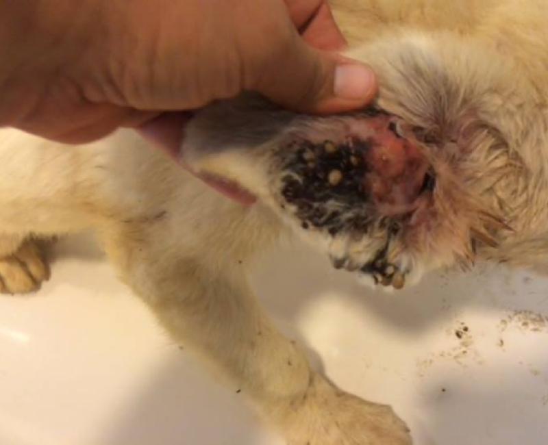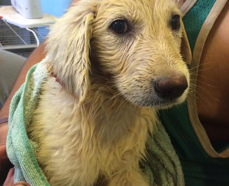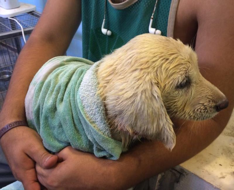 13 de Mayo de 2015: Encontramos una acogida para ella y ha sido llevada al veterinario: presenta desnutricion severa, infeccion en la oreja y erlichia. Psicologicamente sigue asustada y con temor a los humanos, pero comienza a mover el rabito tímidamente.