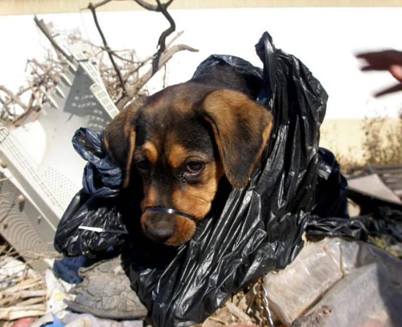CAMPA - Cachorra metida en una bolsa de basura con una brida en el hocico