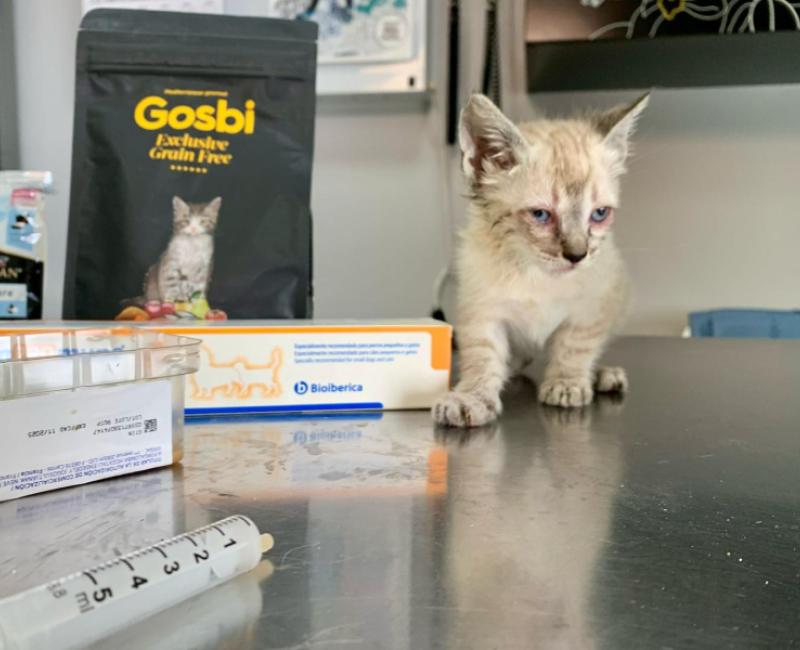 Carmen es una de los dos bebitos que han nacido en una colonia controlada, de la última gata pendiente de castración. Son dos bebés preciosos pero en el momento de su rescate, tenían aún los ojos cerrados de la infección y cubiertos de pus. La veterinaria consiguió quitarle con suero los pegotes pegados y al abrir salieron litros de pus. Por suerte, con el tratamiento han reaccionado estupendamente y sus ojos están casi perfectos y se recuperarán a la perfección.
