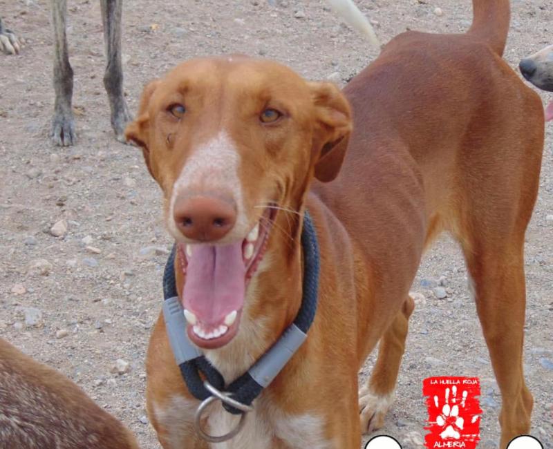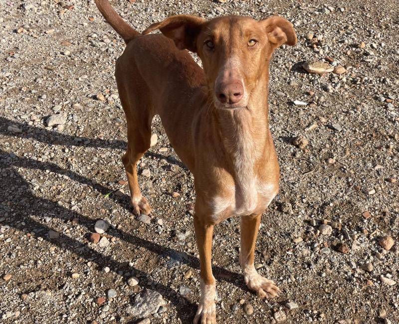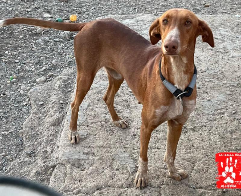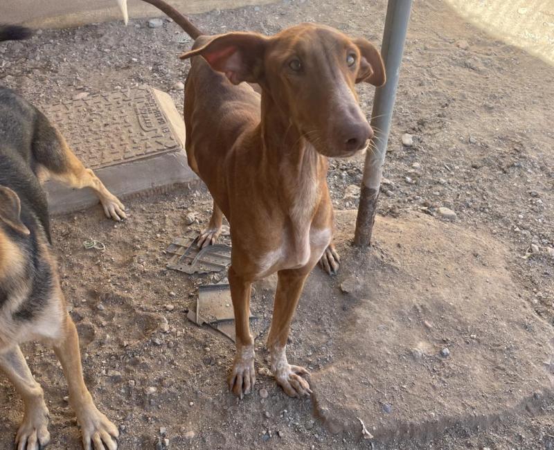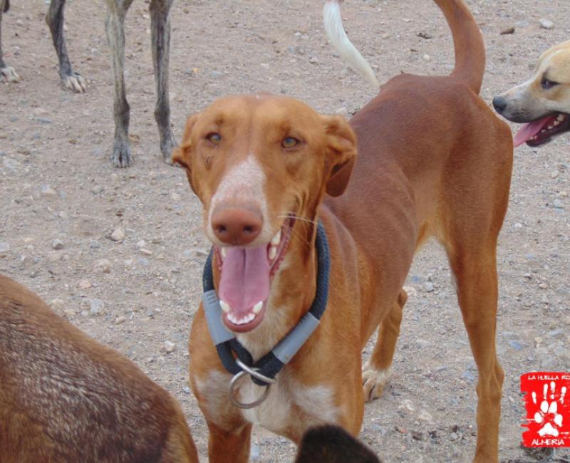 Esta preciosidad de podenca llevaba tiempo vagando por un pueblo. Esperaba a las familias que la alimentaban en la puerta de sus casas, los recibía cariñosamente al volver de los trabajos, los acompañaba al pasear a sus perros, jugaba con todos ellos. Pero lógicamente no a todos los vecinos les gustaba esa situación, así que varias veces habían llamado a la policía para que se la llevaran.