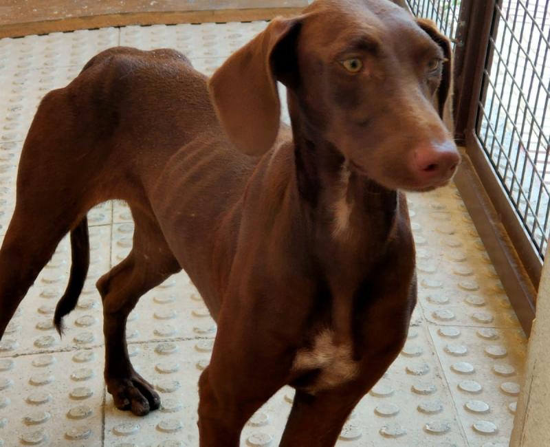 CLEO fue abandonada en una gasolinera de un pueblo de Almería. Los coches le pitaban para que se apartara pero la pobre estaba asustada y desorientada. No sabía para donde caminar.