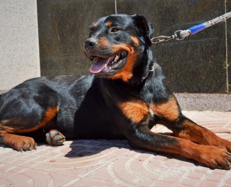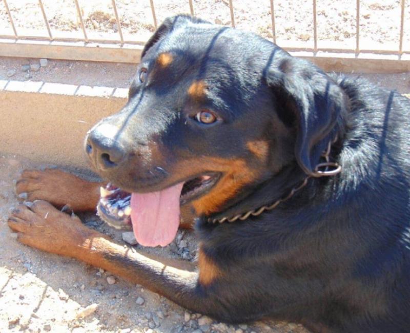 Es un macho joven, con claros indicios de haber sido maltratado. Si se habla en un tono elevado o se mueven los brazos por encima de los hombros, se tira al suelo temblando.