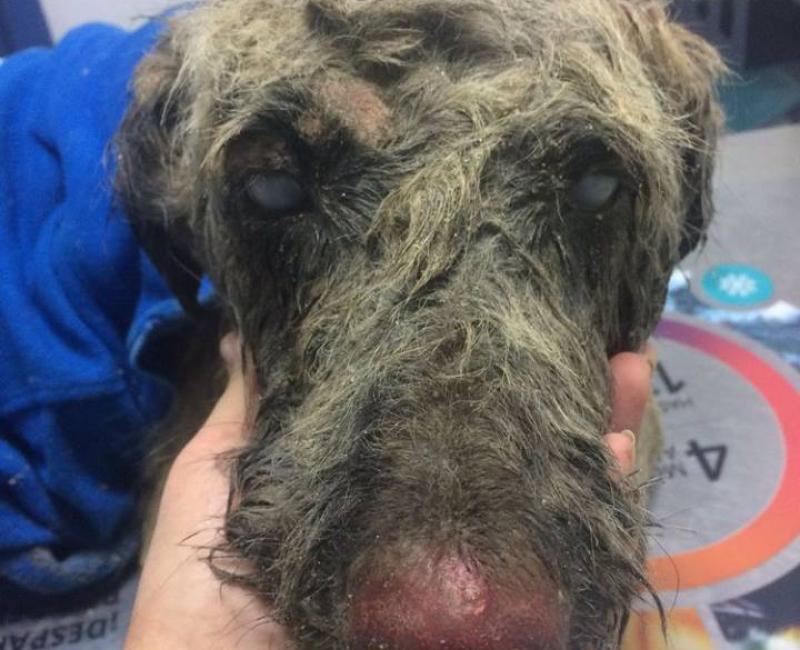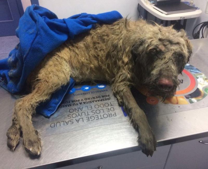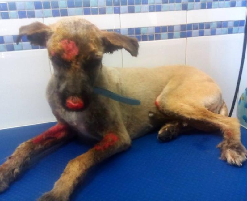 Lo bañaron y le quitaron una gran cantidad de cemento del interior de la boca, le hicieron un lavado de estómago y radiografías. Tenia las corneas, lengua, nariz y patas quemadas por el cemento. Pasó unos dias sin poder comer del dolor, no se mantenia en pie.