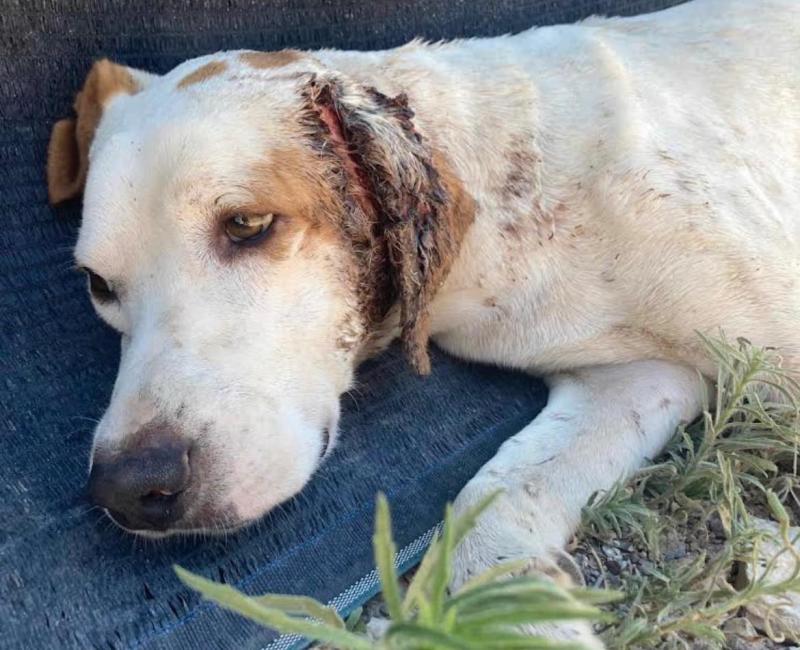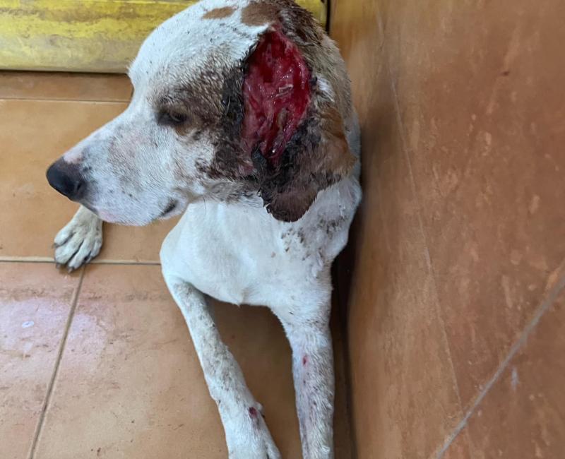 El pequeño HELECHO, probablemente atacado por otro perro, estaba lleno de heridas que supuran, con la oreja desgarrada, con osteomelitis en su pata trasera, con una anemia severa e infección generalizada.