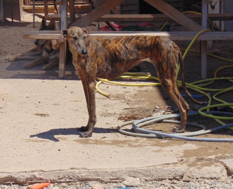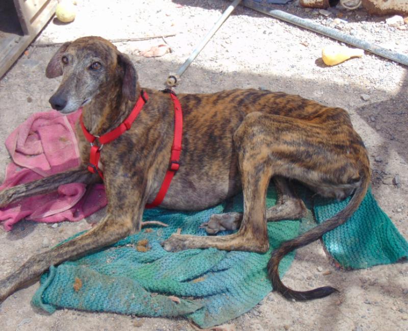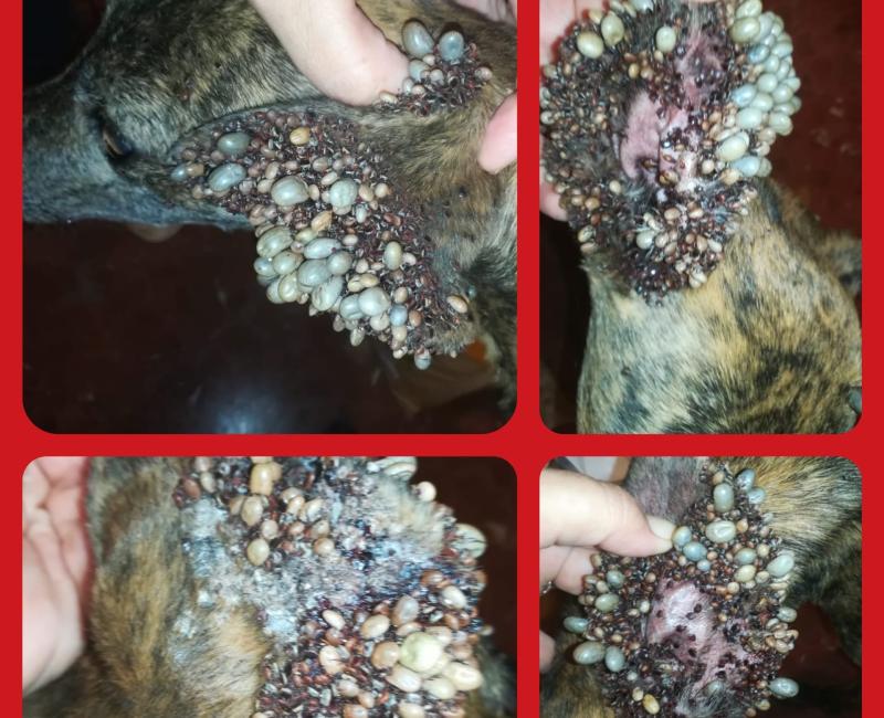 Esta preciosa galga a la que hemos llamado HELIX estaba siendo devorada por las garapatas. Tambaleándose sin apenas fuerzas, esta pequeña se acercó a una terraza de un bar pidiendo auxilio. Suplicando un poco de comida y agua. JAMÁS VIMOS ALGO IGUAL. En su famélico cuerpo más de 1000 garrapatas adheridas.