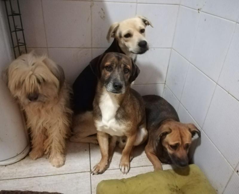 Hace un par de noches, al recogerse nuestra compañera, encontró está escena en la puerta del refugio: Junto a los contenedores habia 5 perros aterrados (4 machos y 1 hembra). En principio pensó que eran cachorros ya que era tarde y habia poca luz, pero no, son todos adultos. Aprovechando estas fechas los hemos llamado Hojaldrina, Polvoron, Mantecado, Turrón y Mazapán.