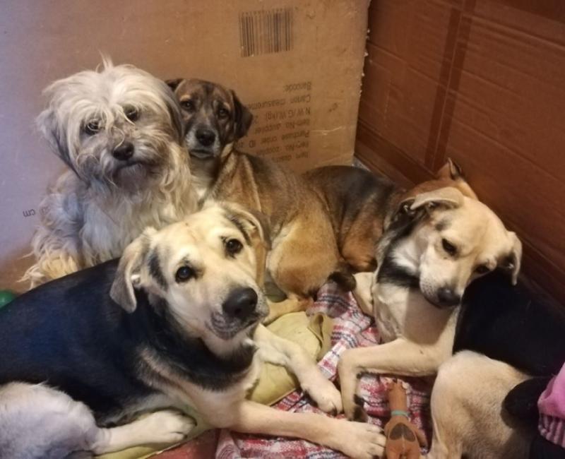 Hace un par de noches, al recogerse nuestra compañera, encontró está escena en la puerta del refugio. Junto a los contenedores habia 5 perros aterrados (4 machos y 1 hembra). En principio pensó que eran cachorros, era tarde y habia poca luz, pero son todos adultos.