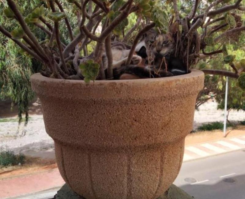Dos amigas de la asociación llevaban tiempo alimentando a esta gata salvaje, sabían que había parido pero no localizaban donde. Cuando lo hicieron se quedaron atónitas: en un macetero en el filo de una cornisa; con el riesgo de que los bebés se estamparan contra el suelo.