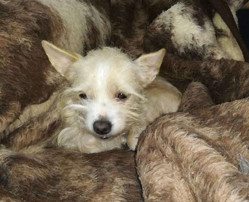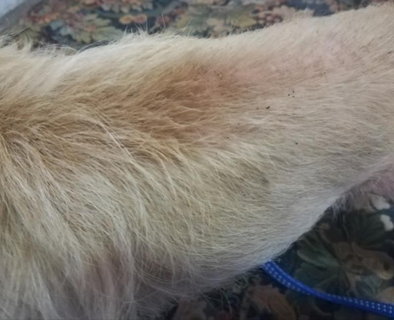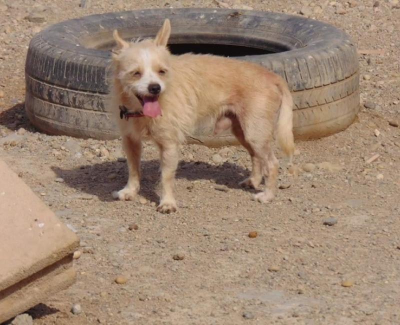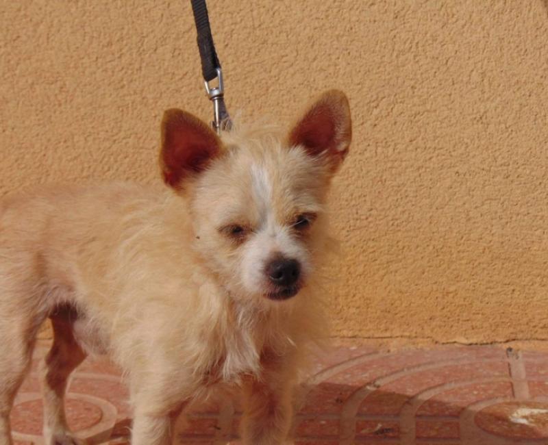 Entregado por "su familia" en el centro zoosanitario, cuajado de pulgas. No apto para niños, es un perro algo miedoso e inseguro.