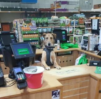 22 de Marzo de 2018: Nocilla, ahora llamado Barney, le gusta unirse a su padre en el trabajo a veces. Después de haber nacido en el refugio y pasar sus primeros tres años de vida allí lo ha hecho muy bien para adaptarse a, no sólo vivir en una casa sino trabajar en una tienda también!.