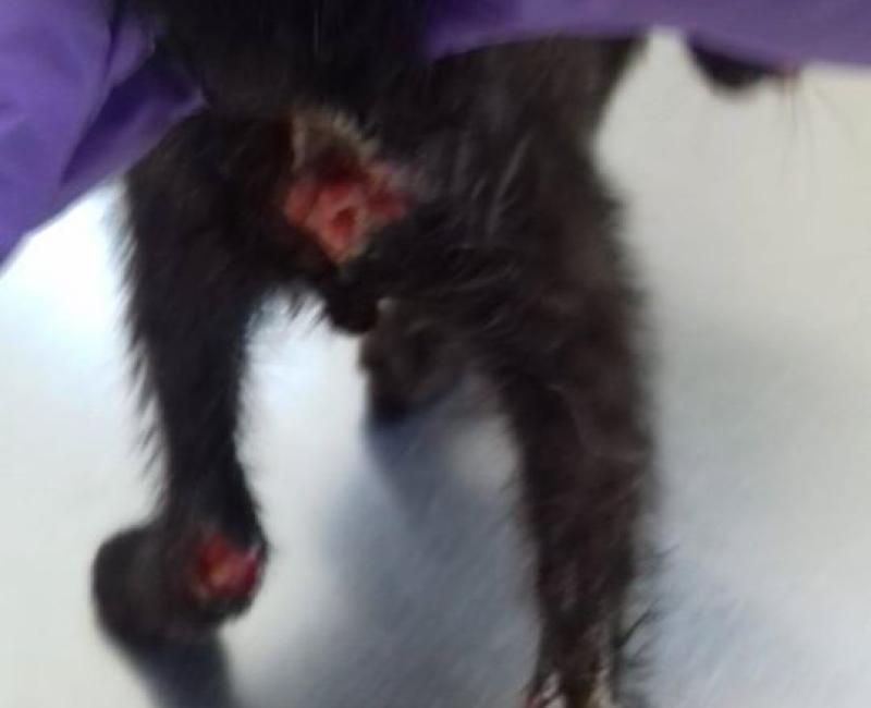Este pequeño apareció debajo de un coche. Por la clase de quemaduras creemos que pudo meterse en el motor y por eso su carita (trufa y boca). La zona del ano y parte de las patitas traseras las tiene el pobre en carne viva. Ya está en una casa de acogida, recuperándose y en tratamiento para las quemaduras, para sus ojitos,…