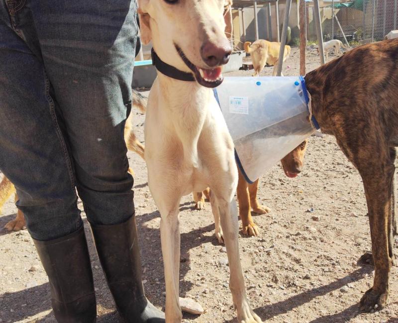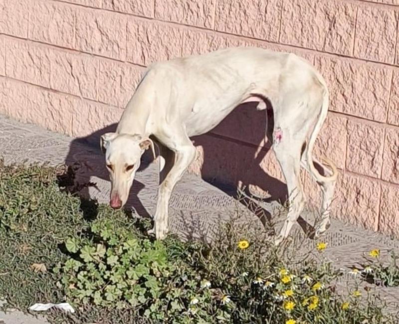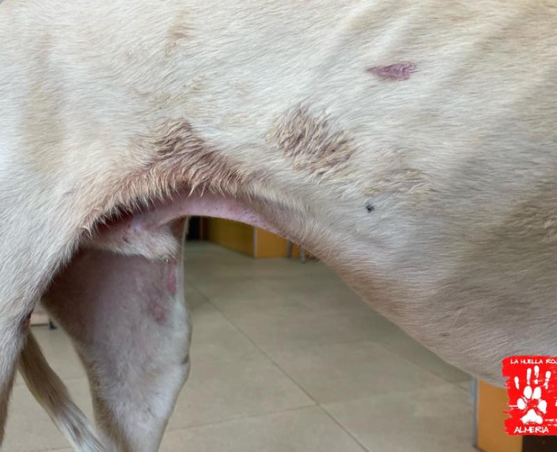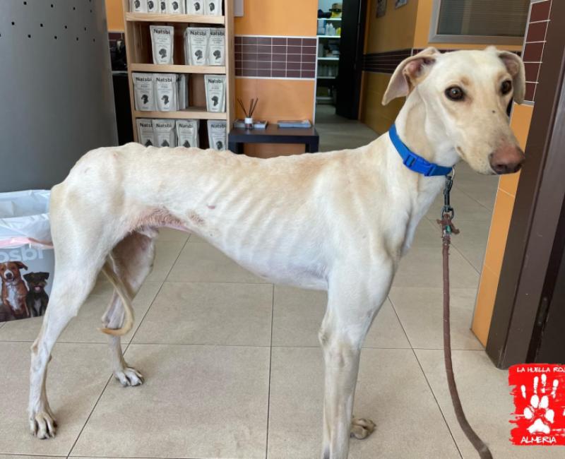 Este galgo lleno de heridas apareció por un pueblo, sin dejarse coger, varios son los avisos que se recibieron. Gracias una vez más a nuestra amiga Apda Rosas que acudió con su jaula trampa, pudo ser rescatado.