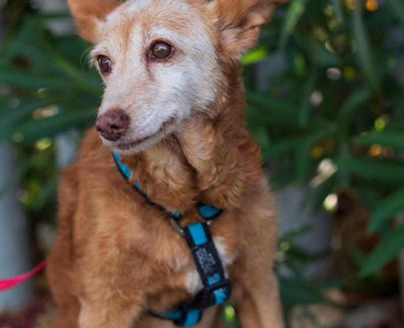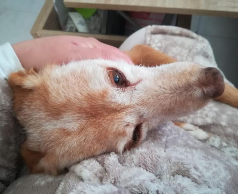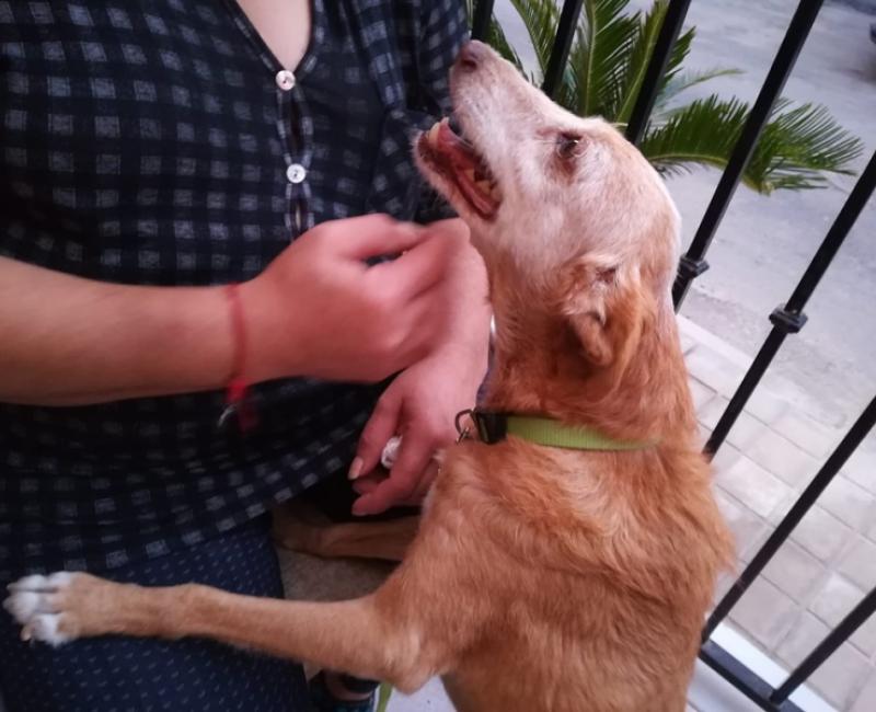 Después de muchos meses abandonada en un pueblo, alguien se decidió a ayudarla. Era alimentada por los vecinos de la zona. Es una perrita sumisa y súper cariñosa. La chica que nos avisó nos cuenta que la otra noche la sintieron gritar y al salir los vecinos a auxiliarla vieron que llevaba una serpiente colgando de su oreja...
