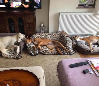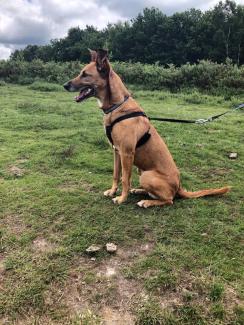 9 Julio 2019, Recibimos noticias de: Poste tiene un fabuloso hogar y una familia encantadora, nos dicen que se comporta muy bien. Se ve guapo con su nuevo arnés, disfruta del jardín y de sus nuevos amigos. Es feliz en su nueva y cómoda cama.