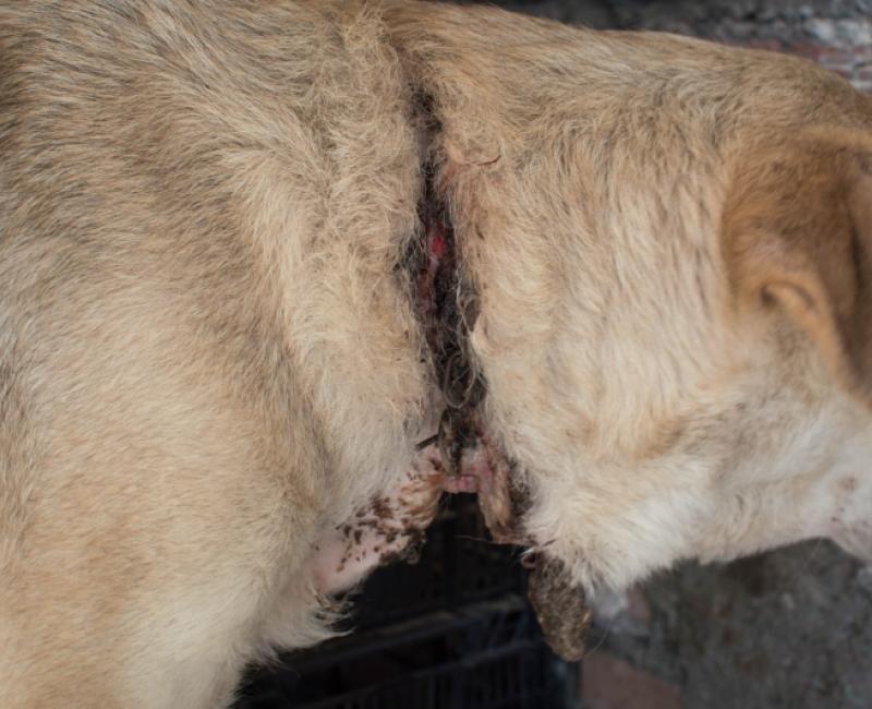 Ha sido intervenida de urgencia para poder retirarle todo el metal. Su estado es grave ya que además, presenta una fuerte infección debido al mal estado de la herida. Ha quedado ingresada en la clínica veterinaria para poder tenerla más controlada.