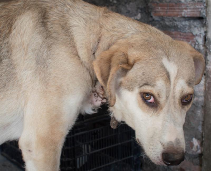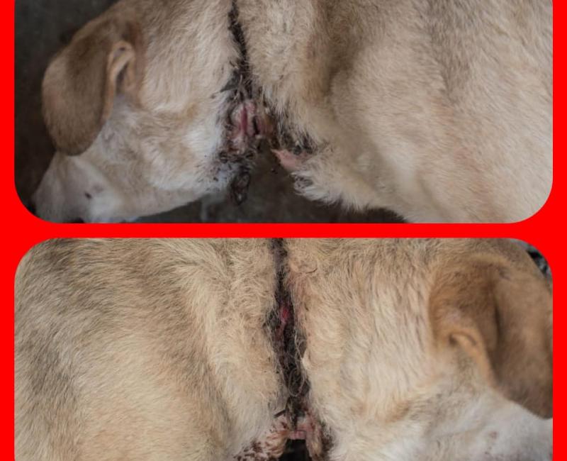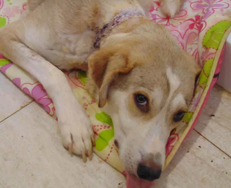 Raya ha pasado casi toda su vida encadenada. Empezó siendo una cachorra y poco a poco fue creciendo sin que nadie se preocupase por ella, por ir agrandandole el collar de cadena que rodeaba su cuello. No imaginamos el dolor que ha debido de padecer mientras los eslabones le rasgaban la carne, mientras la estrangulaban y se incrustaban en su cuerpo, hasta el punto de que en algunas zonas ya había crecido nuevo tejido sobre ellos..