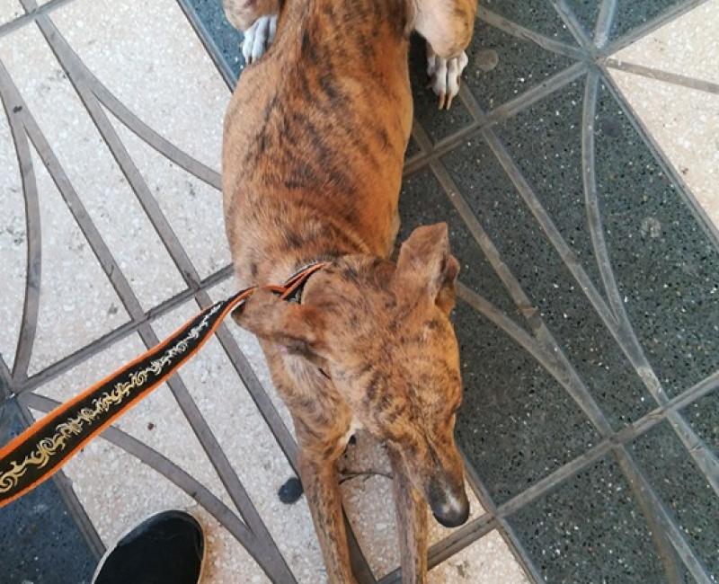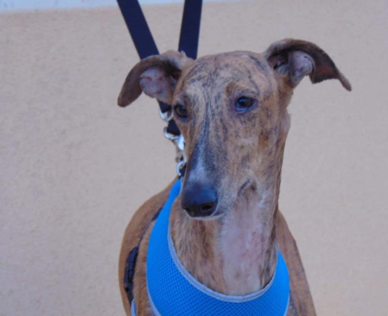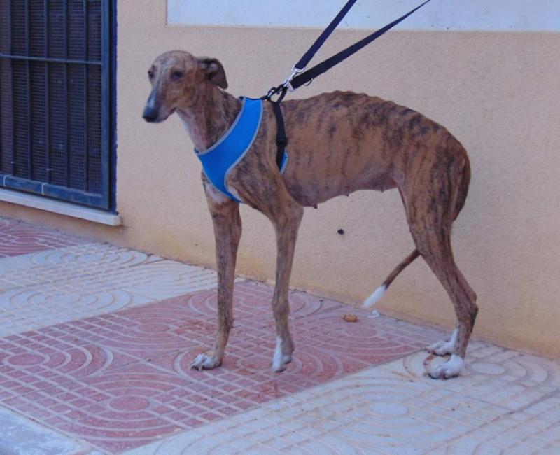 Temblando, paralizada por la debilidad y apagándose poco a poco. Así estaba esta preciosa galga, a la que hemos llamado Rosario, en el parking de un supermercado en Vicar. Presenta una leve cojera en una de sus patas traseras, seguramente alguna fractura antigua, lo que hace que ya no sea "útil".