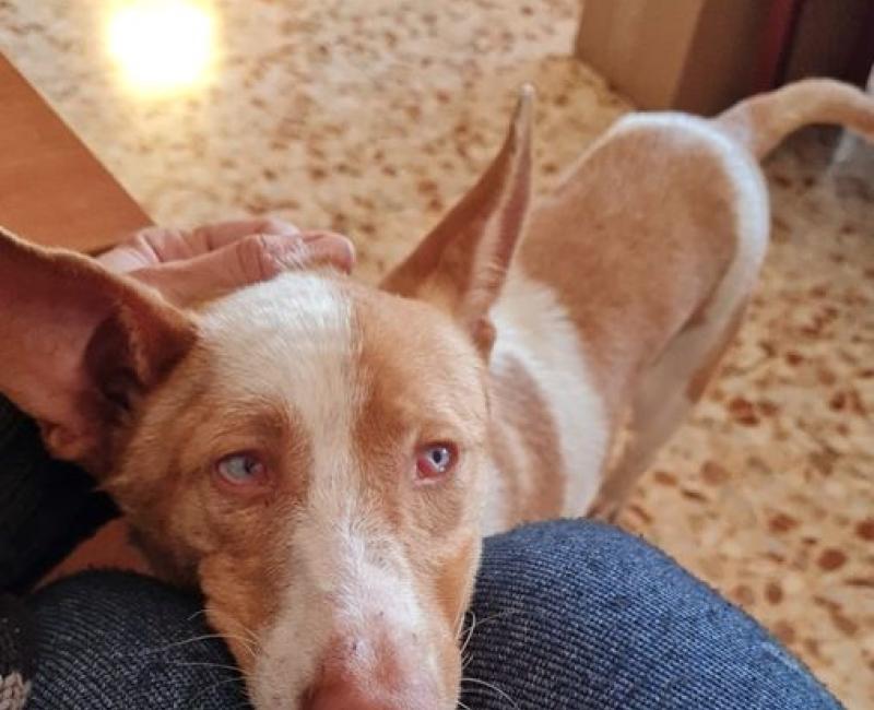 No sabemos cómo ha podido sobrevivir todo este tiempo solo en la calle. Quizás lo hayan abandonado al darse cuenta de su condición ya que apenas ve y no escucha nada. Lamentablemente eso ha causado que fuese atropellado partiéndole el fémur pero sus limitaciones las compensa con cariño y ternura. Pese al dolor que debe estar sufriendo no se queja y busca tu mano para lamerla.