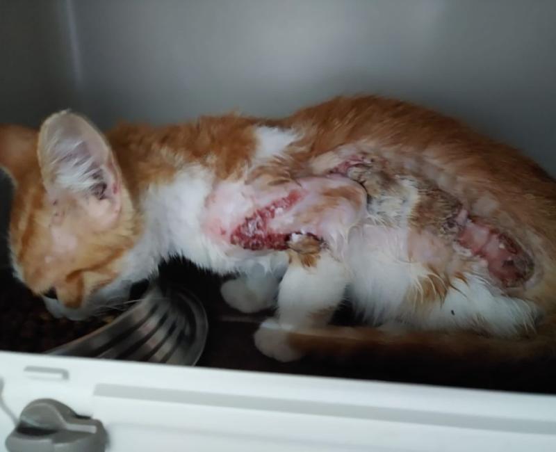 Este pequeñin es Tigger, en estas condiciones lo hemos encontrado...La veterinaria está prácticamente segura que sus lesiones son producidas por el motor de un coche. Por eso es tan importante, golpear el capó del coche antes de arrancar.