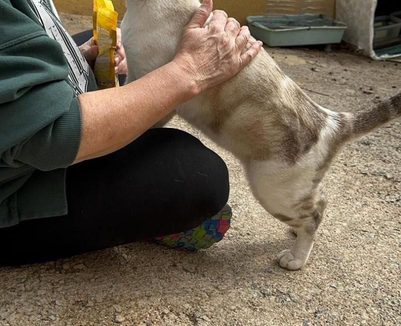 Hace un par de meses apareció en una colonia. No saben cómo llegó allí pero a los pocos días se había hecho el dueño y señor de toda la colonia, echando a todos de allí. Los pobres que llevaban allí años, andaban desubicados en la carretera debajo de los coches y no les dejaba ni resguardarse en las casetas ni comer. Así que su cuidadora nos escribió súper desesperada, rogando un hueco para él.