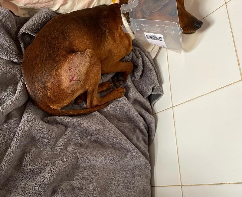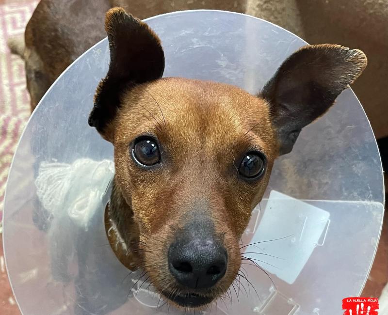 Este pequeñín se encontraba deambulando por un pueblo de Almería. Por desgracia, fue atacado por otro perro. No son lesiones graves pero si molestas. Esta con antibióticos y antiinflamatorios.