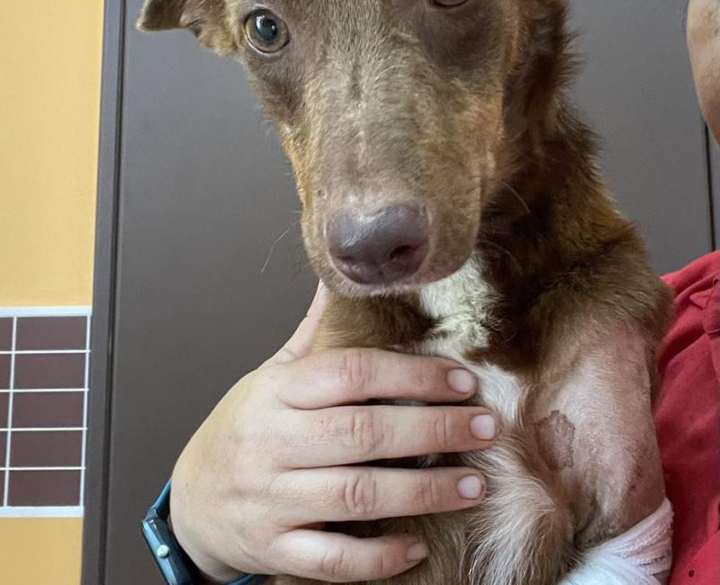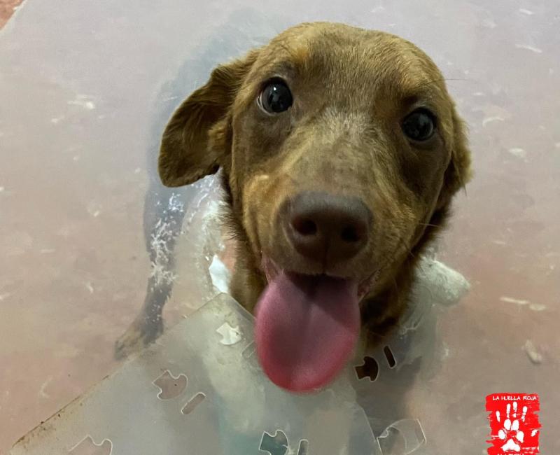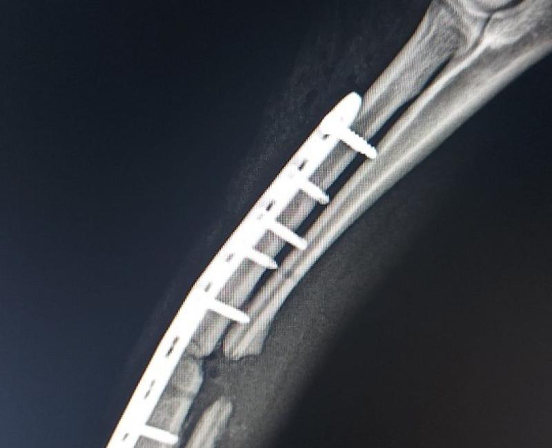 El pequeño ya ha pasado por el veterinario, tiene el cúbito y el radio fracturados. Ha tenido que pasar por quirófano para ponerle una placa y tornillos y ahora se recupera lenta pero adecuadamente.