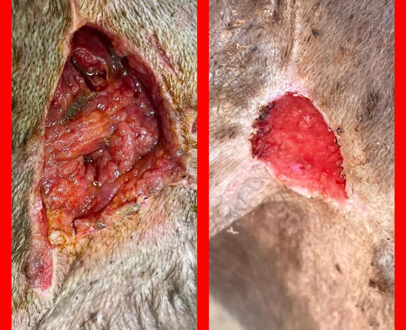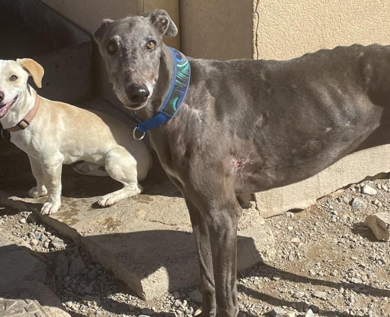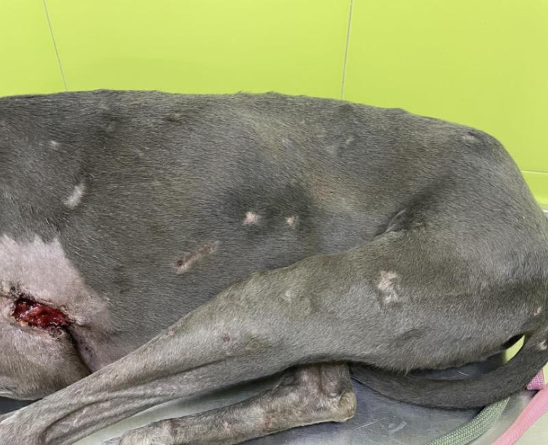 Este precioso galgo fue encontrado por la carretera en estas condiciones. No sabemos qué le ha podido pasar, a priori son mordeduras de perros. Su cuerpo está lleno de cicatrices así que no habrá tenido una vida fácil.