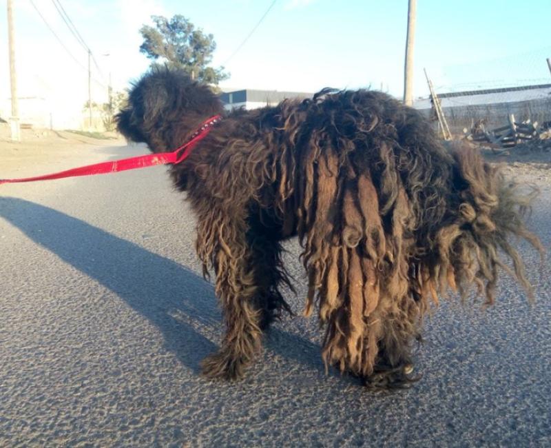 Él es BOB. Lo encontramos tirado en un camino, cojeando de una pata trasera, con largas y sucias rastas que arrastraban por el suelo, lleno de garrapatas y debilitado.