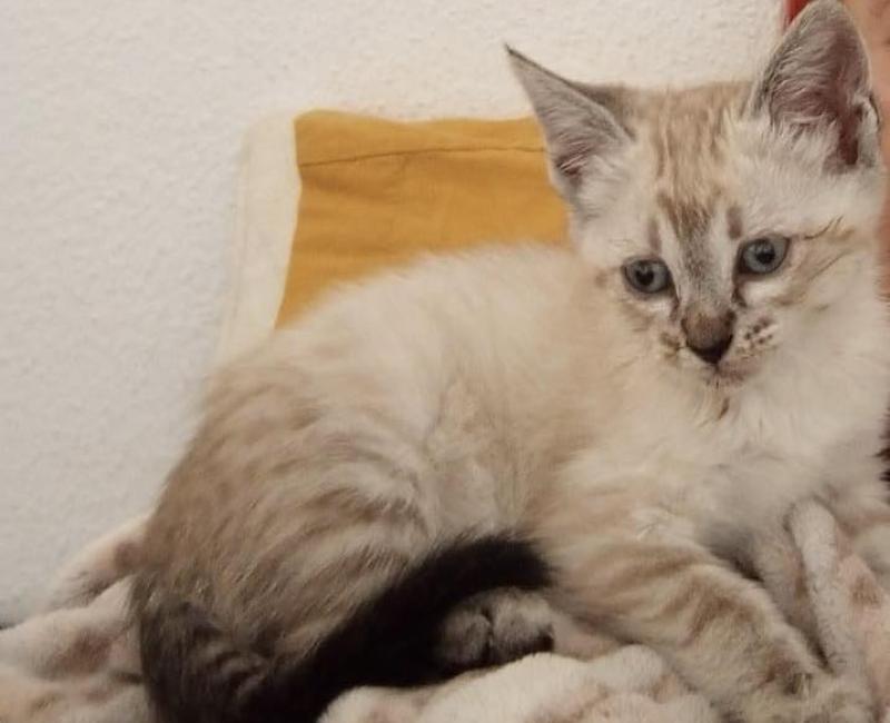 Carmen es una de los dos bebitos que han nacido en una colonia controlada, de la última gata pendiente de castración. Son dos bebés preciosos pero en el momento de su rescate, tenían aún los ojos cerrados de la infección y cubiertos de pus. La veterinaria consiguió quitarle con suero los pegotes pegados y al abrir salieron litros de pus. Por suerte, con el tratamiento han reaccionado estupendamente y sus ojos están casi perfectos y se recuperarán a la perfección.
