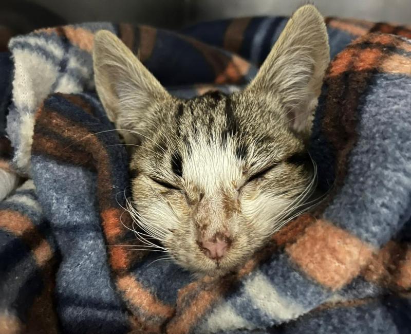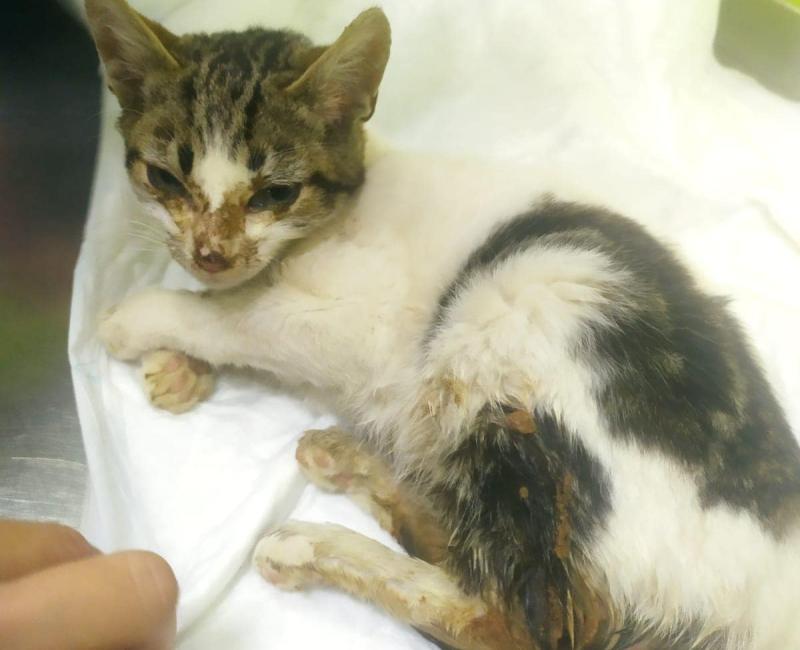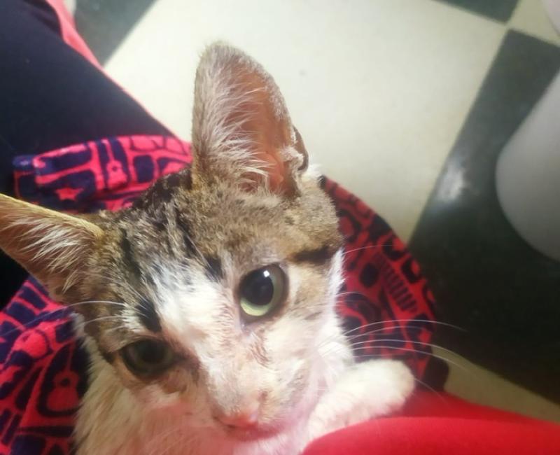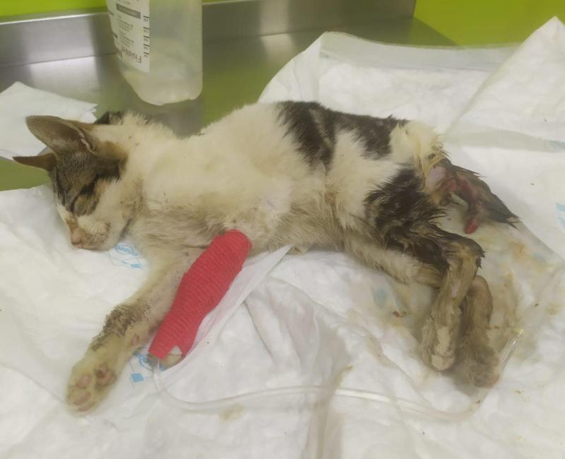 02 Marzo de 2023: Este pobre gatito apareció en una colonia, en la cual nunca había sido visto. El pobre quizás fue dejado por alguien allí, dentro de una de las casetas, súper enfermo, muy deshidratado, con muchísimas diarreas. Se hizo la prueba de panleucopenia dando negativo, así que el pobre se quedó ingresado con suero y antibióticos para intentar que remontara.
