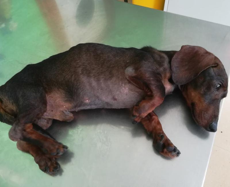 Cohete, fue abandonado por su dueña en el centro zoosanitario en el estado en el que se ve. Totalmente desnutrido y deshidratado, hasta el punto de tener que ingresarlo para suministrarle suero y estabilizarlo. Estamos pendientes de sus analíticas.