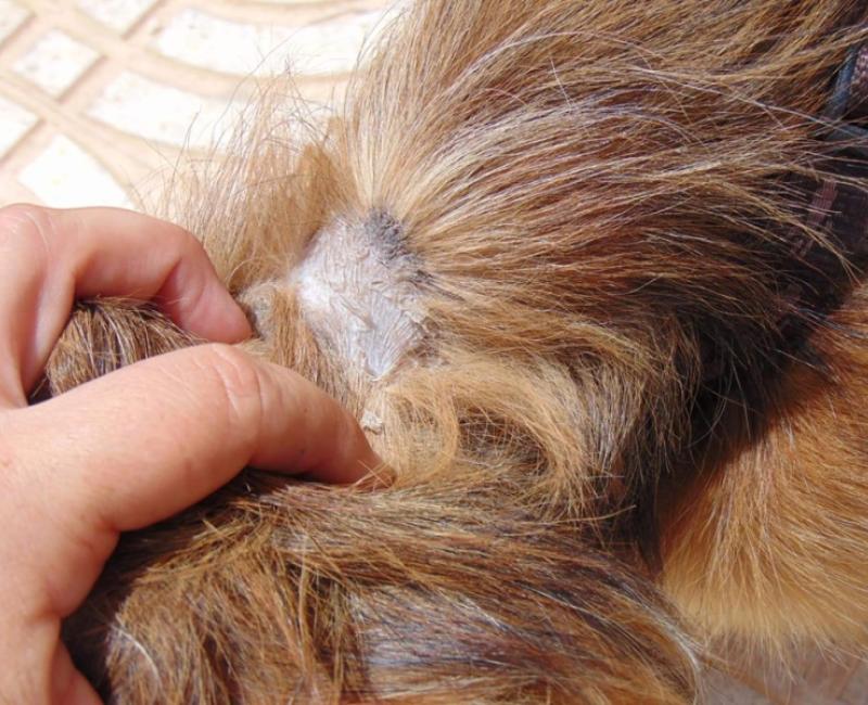 Tiene todo el cuello (marca del collar) sin nada de pelo, pero eso sí, le quitaron el collar para poder atar a otro perro que suponemos que ya tendran y darle la misma vida. Tiene una especie de parálisis en la mitad de su cara pero hace vida totalmente normal.