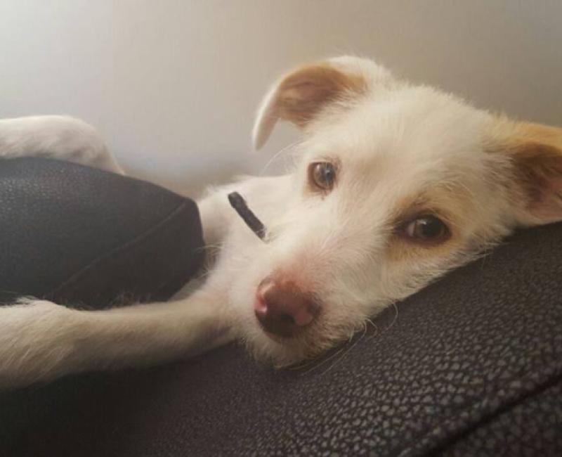 Por suerte no tiene nada roto. Es un perro muy cariñoso y sociable, solo pide mimos y como cachorro que es, pasa el dia jugando.