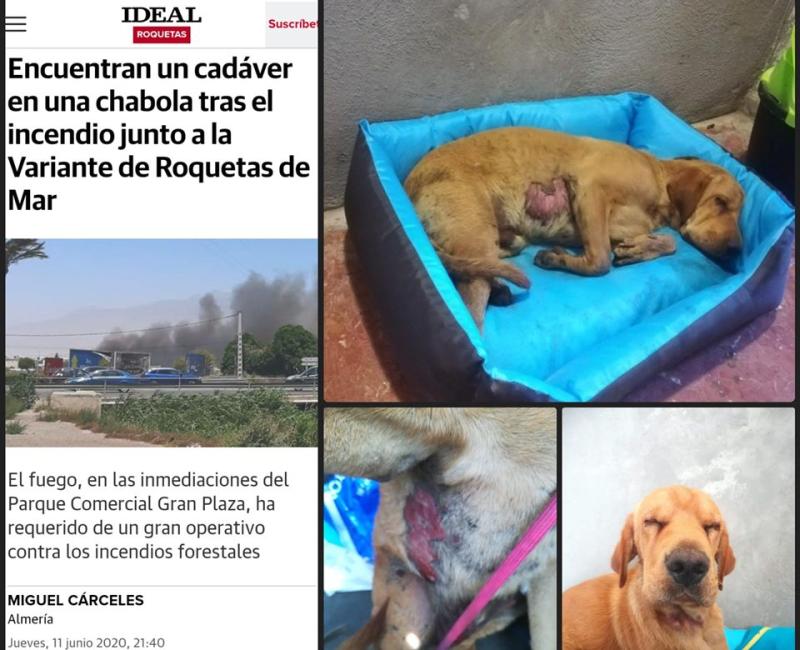 12 Junio de 2020: Ayer recibíamos una llamada de auxilio desesperada. Un gran incendio se declaró sobre las 13:00 horas, bomberos y demás efectivos trataban de sofocarlo pero las fuertes rachas de viento impedían que lo lograsen y el fuego se extendía a gran velocidad. En medio de ese caos, asustado y aturdido se encontraba este pequeño, el cual fue el único que pudo sobrevivir, ni su compañero humano ni otra perrita que vivía allí tuvieron la misma suerte y fallecieron calcinados.