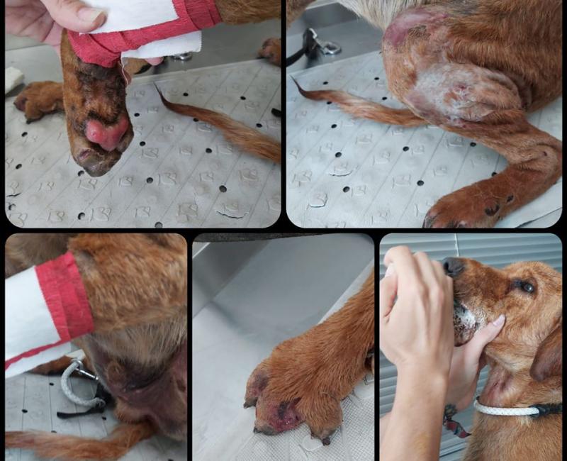 13 Junio de 2020: Queremos agradeceros el interés que estáis teniendo por el estado de nuestro pequeño. Hoy ha vuelto al veterinario y ha decidido dejarle ingresado con suero para garantizar su hidratacion ya que las quemaduras deshidratan mucho los tejidos. Lamentablemente tras una nueva evaluación, se ha podido apreciar que algunas de ellas no son de 2° sino de 3° grado con lo cual su estado es aún más delicado ya que eso provoca fiebre y corre mucho más riesgo de infección. También se le están realizando diversos análisis para ver tanto su nivel de oxígeno en sangre, como el resto de parámetros y enfermedades posibles. Los análisis no son los mejores ya que presenta problemas renales, pero ya está siendo tratado con suero y antibiocos. También se le estan administrando calmantes para evitarle al máximo posible el dolor. Sus heridas son bastante graves pero en este momento es imposible realizarle una limpieza profunda de las mismas ya que para ello habría que retirarle tejidos y eso debe hacerse con el sedado, cosa que pondría en riesgo su vida debido a que está muy débil.