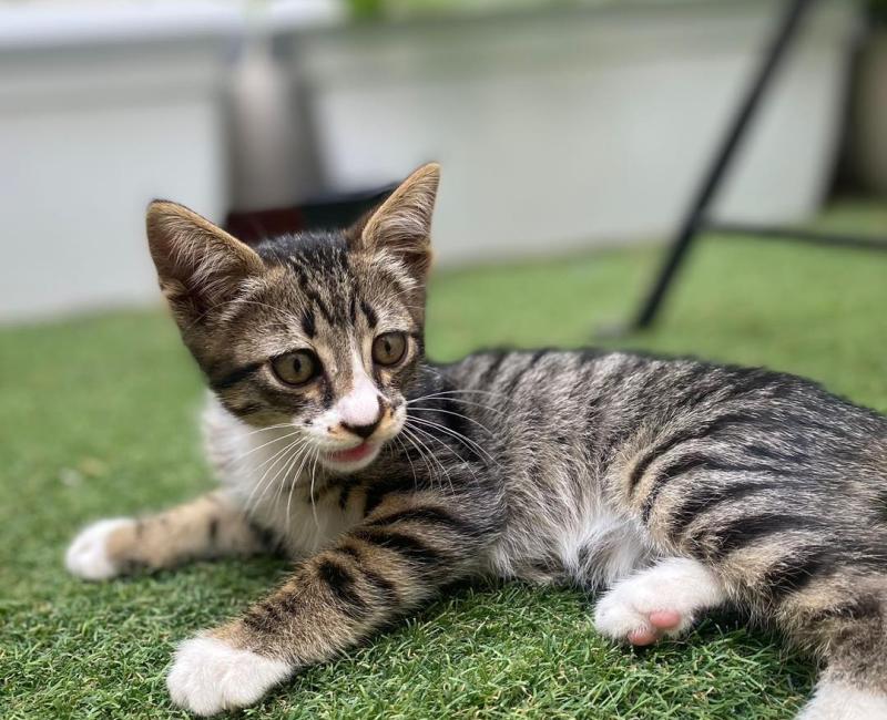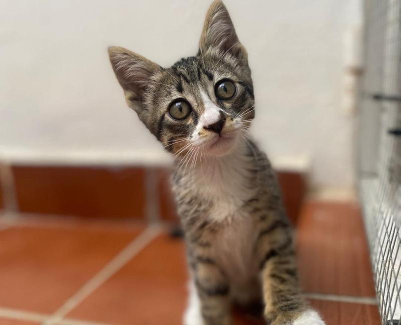 Este mini gatito estaba debajo de un coche, sin parar de maullar. Hasta que una compañera que pasaba por allí, se limitó a decirle: ¿Qué te pasa? y el pobre corrió hacia ella y se hizo un rosquito al lado... Está más que claro que Jaimito es totalmente casero. Se lleva bien con perros.