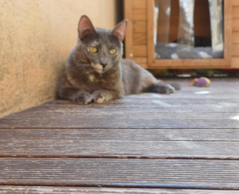 Manzana es súper cariñosa y zalamera, todo el día demandando cariño. Por desgracia van a edificar en lo que ellos consideraban su hogar y al estar ya allí las máquinas estaban muy nerviosos, cruzando calles y desperdigandose. Así que hemos decidido darle un hogar, ya que por suerte teníamos una acogida libre.