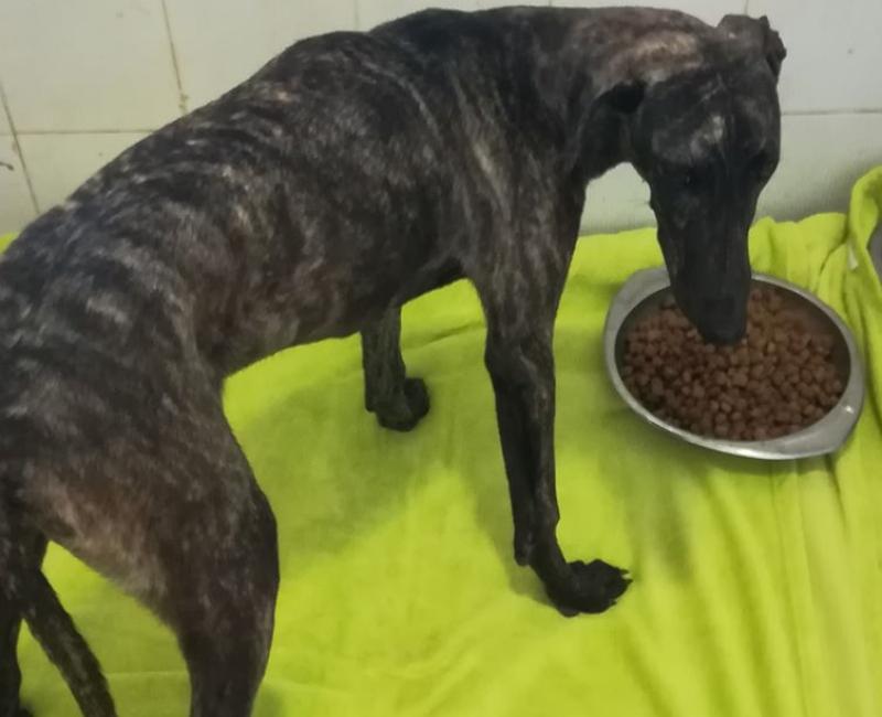 Paquito es un bebe galgo que fue abandonado entre invernaderos. Por suerte, un trabajador de la zona lo vió y estuvo alimentándolo a diario y ganándose su confianza, cosa que al ser un bebé no resultó nada difícil.