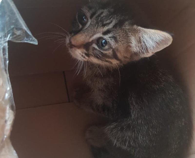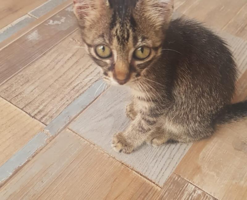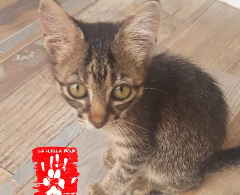 Esta chiquitina estaba acurrucada en una pared. Se le veía bastante débil y asustada. Tiene mocos pero gracias a los cuidados de su casa de acogida, se va recuperando muy bien. Ya come solita.