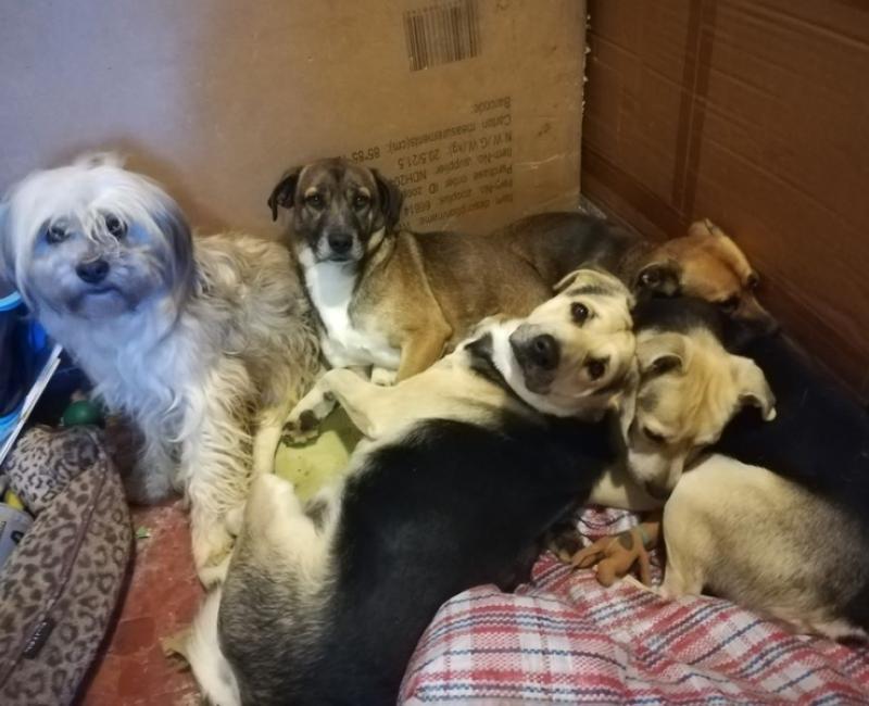 Hace un par de noches, al recogerse nuestra compañera, encontró está escena en la puerta del refugio. Junto a los contenedore habia 5 perros aterrados (4 machos y 1 hembra). En principio pensó que eran cachorros, era tarde y habia poca luz, pero son todos adultos.
